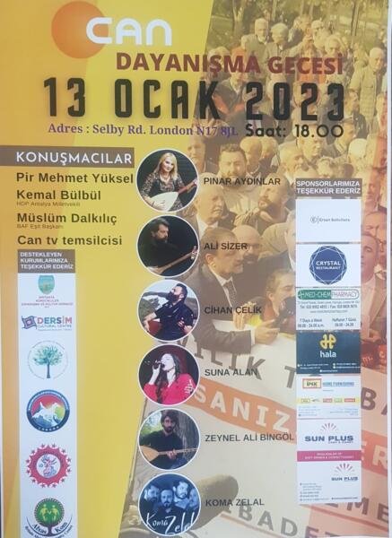 Alevilerin sesi ve soluğu olan Can Tv ile dayanışma amacıyla Londra Selby Center’da 13 Ocak (Cuma) günü dayanışma gecesi düzenlenecek. HDP Milletvekili Kemal Bülbül, Pir Mehmet Yüksel, BAF Eşit Başkanı Müslüm Dalkılıç’ın konuşmacı olarak katılacağı gecede, Pınar Aydınlar, Ali Sizer, Cihan Çelik, Suna Alan, Zeynel Ali ve Koma Zelal sahne alacak.