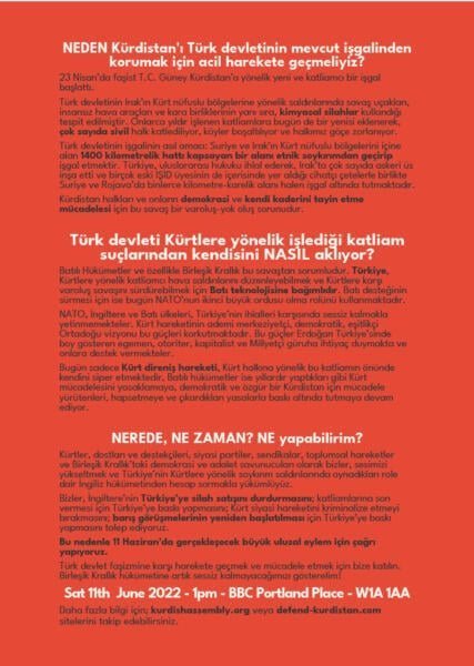 Britanya Kürt Halk Meclisi, 11 Haziran günü ‘Kürdistan’ı savun’ şiarıyla Londra BBC binası önünde yapacakları eyleme tüm ilerici yurtsever, demokrat, aydın ve insanlık onurundan yana olan herkesi davet etti.