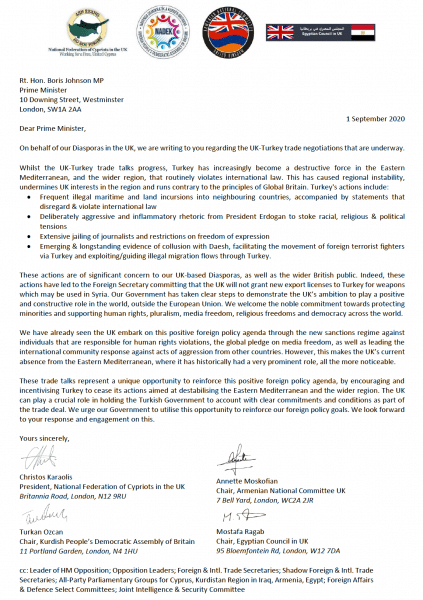 Birleşik Kırallık Kıbrıslılar Federasyonu (NFC-UK), Britanya Kürt Demokratik Toplum Merkezi (NADEK), Britanya Ermeni Ulusal Komitesi (ANC-UK) ve Birleşik Krallık Mısır Konseyi (ECUK) Başkanlarının imzasıyla gönderilen mektubun İngiliz Başbakana ulaştığı bilgisini ise NFC-UK Başkanı Christos Karaolis gazetemizle özel olarak paylaştı. Karaolis gazetemize yaptığı kısa değerlendirmede, ‘Britanya Türkiye ticari anlaşmaları, Britanya’nın uluslarası hukukta demokrasiye ne kadar sahip çıktığınıda gösterecektir’ ifadelerine yer verdi.