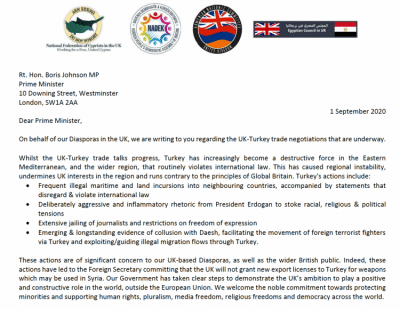 İngiltere – Geçtiğimiz gün Britanya Kıbrıslılar Federasyonu İngiliz Başbakan Borris Johnson’a bir mektup göndererek, Britanya-Türkiye ticari anlaşmalarının gözden geçirlmesini talep etti. Mektupda ayrıca Türkiye’nin İŞİD ile olan bağlantıları ile uluslararası hukuk ihlallerine de vurgu yapıldı.