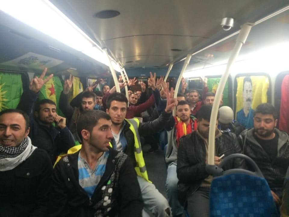Yapılan büyük yürüyüşün ardından bir grup genç iki katlı kırmızı otobüslerden birisine binerek, tüm otobüsü PKK bayrakları ve Kürt halk önderi Abdullah Öcalan’ın posterleriyle donattı. Gençlerin eylemi otobüsün son durağına kadar devam etti.