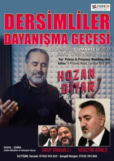 Londra’da her yıl geleneksel olarak düzenlenen Dersimliler Dayanışma Gecesi, bu yıl sanatçı Diyar’ın katılımıyla 25 Aralık günü Prenses Düğün Salonu’nda gerçekleşecek.